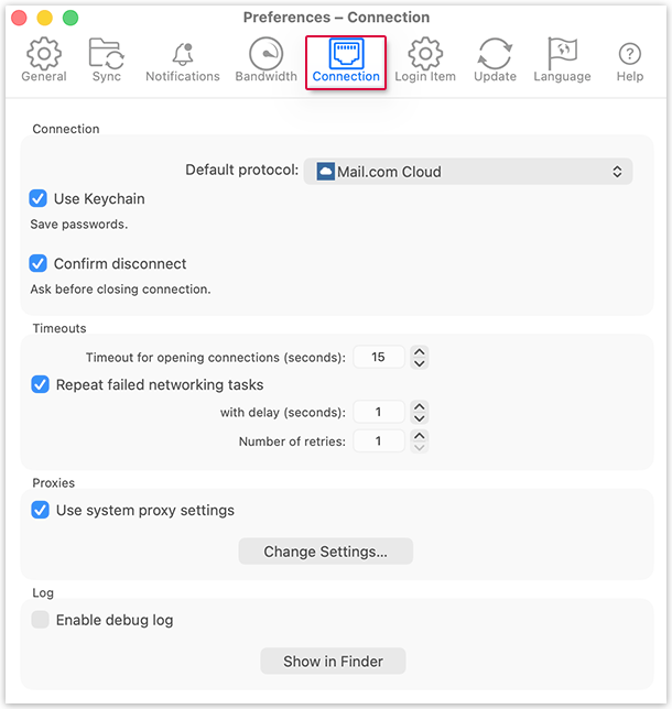Choose the dafault protocol (at the moment mail.com Cloud is pre-selected and cannot be changed).