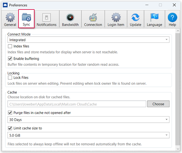 Select the cache path. You can choose whether files should be removed from the cache
